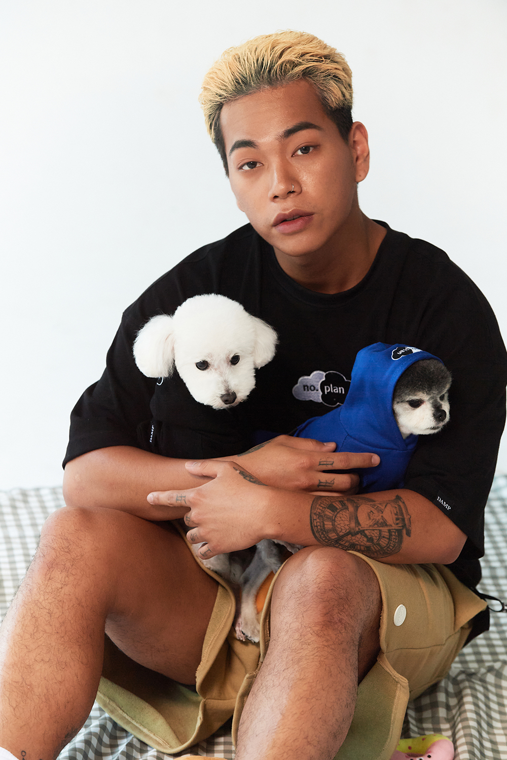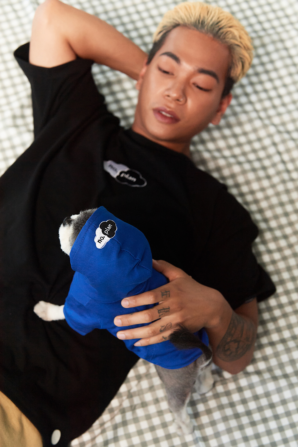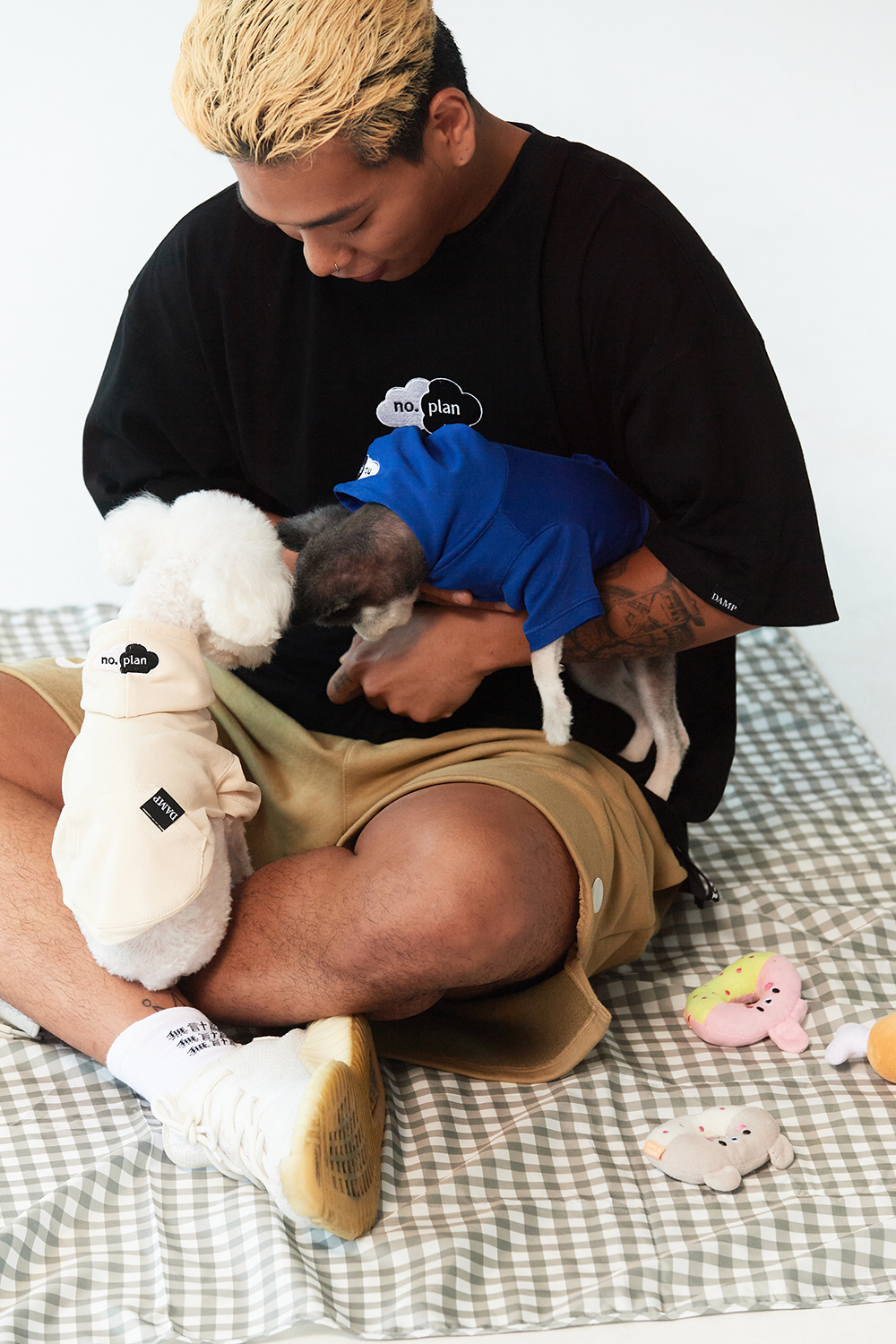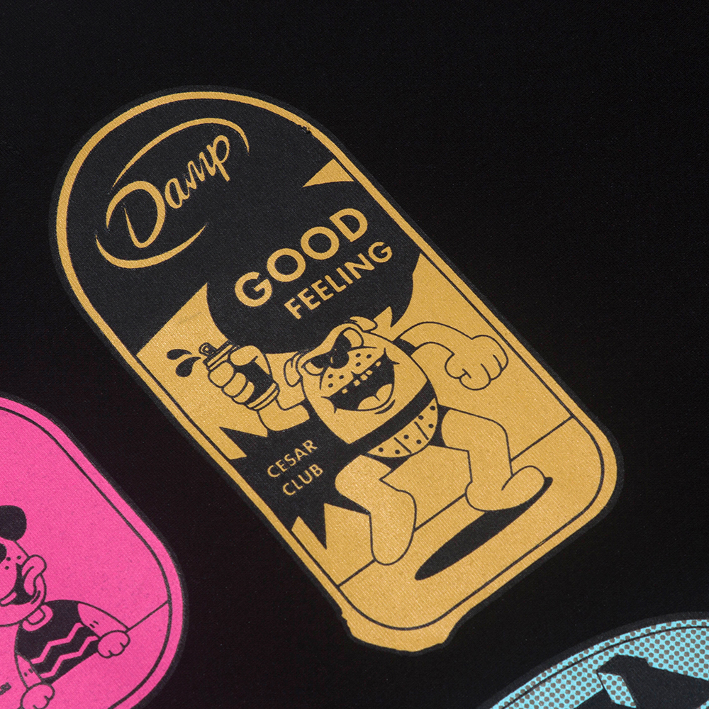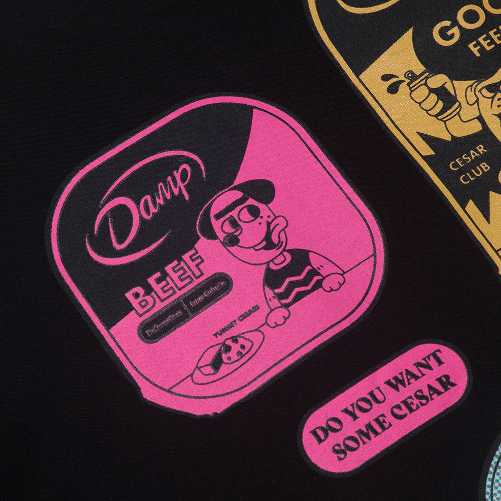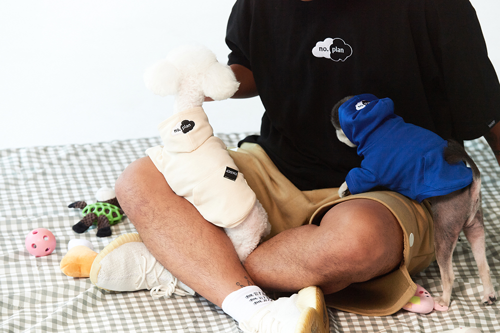 일러스트레이터 정크와의 협업을 통해 탄생한 노플랜 클라우드 로고는 오랫동안 사랑받은 돈애스크마이플랜의 박스로고를 협업 주제에 맞게 정크가 새롭게 풀어낸 로고입니다.강아지 커플룩을 주제로한 이번 협업과 너무 잘 맞아 메인 디자인으로 선보이게 되었습니다. 지난 정크와의 협업 내용은 꼭 한 번 확인해 보세요. - 전면에는 노플랜 클라우드를 로고를 자수하여 표현하였습니다. 뒷면에는 일러스트레이터 정크의 그래픽으로 더했습니다. 이번 일러스트는 애완견들이 사랑하는 시저 캔을 모티브로 정크와 돈애스크마이플랜 만의 감성으로 위트있게 풀어냈습니다.