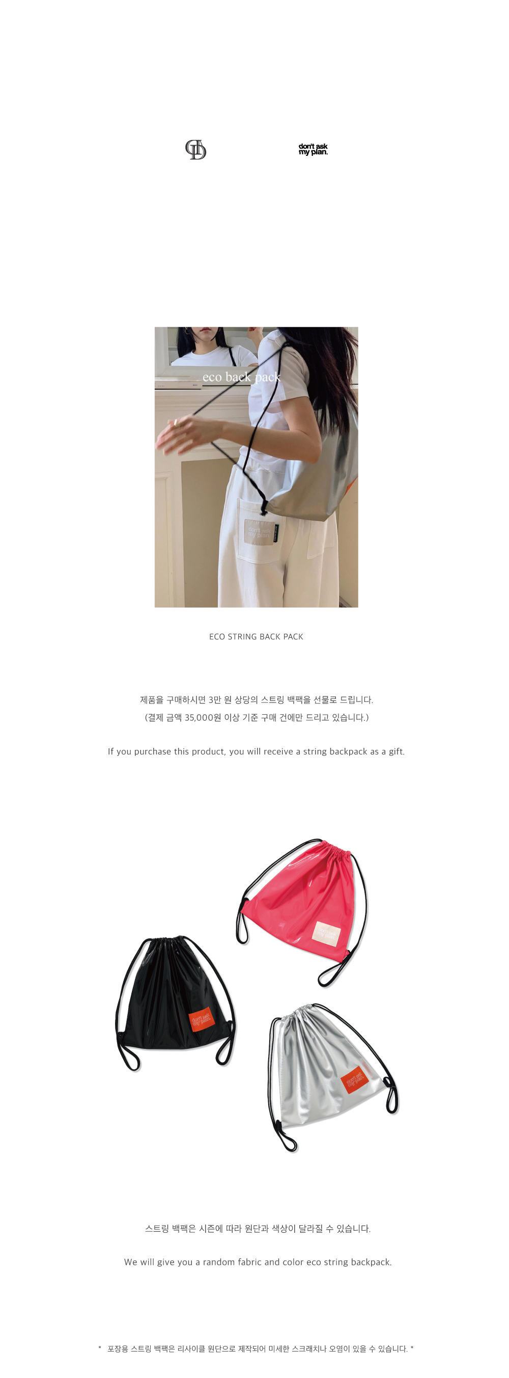 - 라벨: 2017 A/W 시즌부터 제품의 왼쪽 뒷면에 봉제 되기 시작한 'Tail label'은 시즌을 거듭할수록 발전되었습니다. 처음에 Don't Ask My Plan의 상징으로 일반 라벨 소재로 제작되었다가 라벨이 빠르게 상하는 것을 우려하는 고객분들이 늘어 코팅하여 더욱 단단하게 작업을 하였습니다. 하지만 나염이라는 특성상 라벨이 빨면 빨수록 프린팅이 지워지는 것을 안타까워하는 고객분들이 많아져 현재는 직접 실을 짜서 만들어진 직조라벨로 발전되어 더욱 고급스럽고 지워지지 않는 'Tail Label'이 되었습니다. 'Tail label' 가위 모양을 따라 원하지 않으시면 제거할 수 있으며 제거한 라벨로 책갈피 및 다양한 용도로 사용 가능합니다.