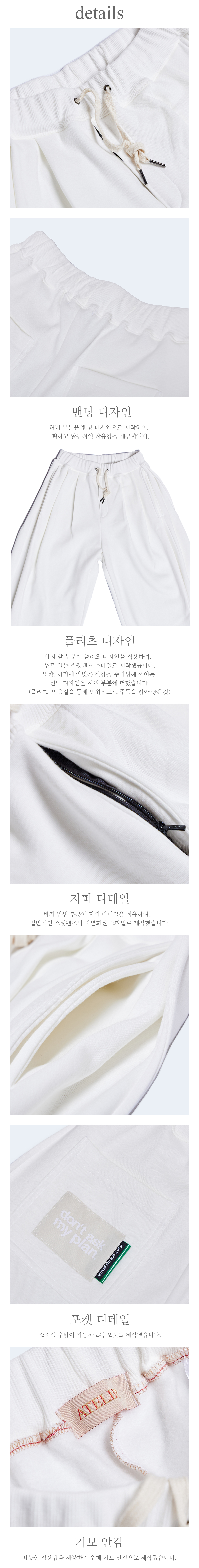 * 플리츠-주름(천의 위나 옆 부분을 박음질하여 영구적으로 잡아 놓은 것) - 디테일: 바지 뒷주머니 부분에 DAMP를 상징하는 위트 있는 라벨 디자인을 적용했습니다. 또한, 바지 밑위 부분에 지퍼 디테일을 적용하여 일반적인 스웨트 팬츠와는 다른 차별화된 디자인으로 제작했습니다.