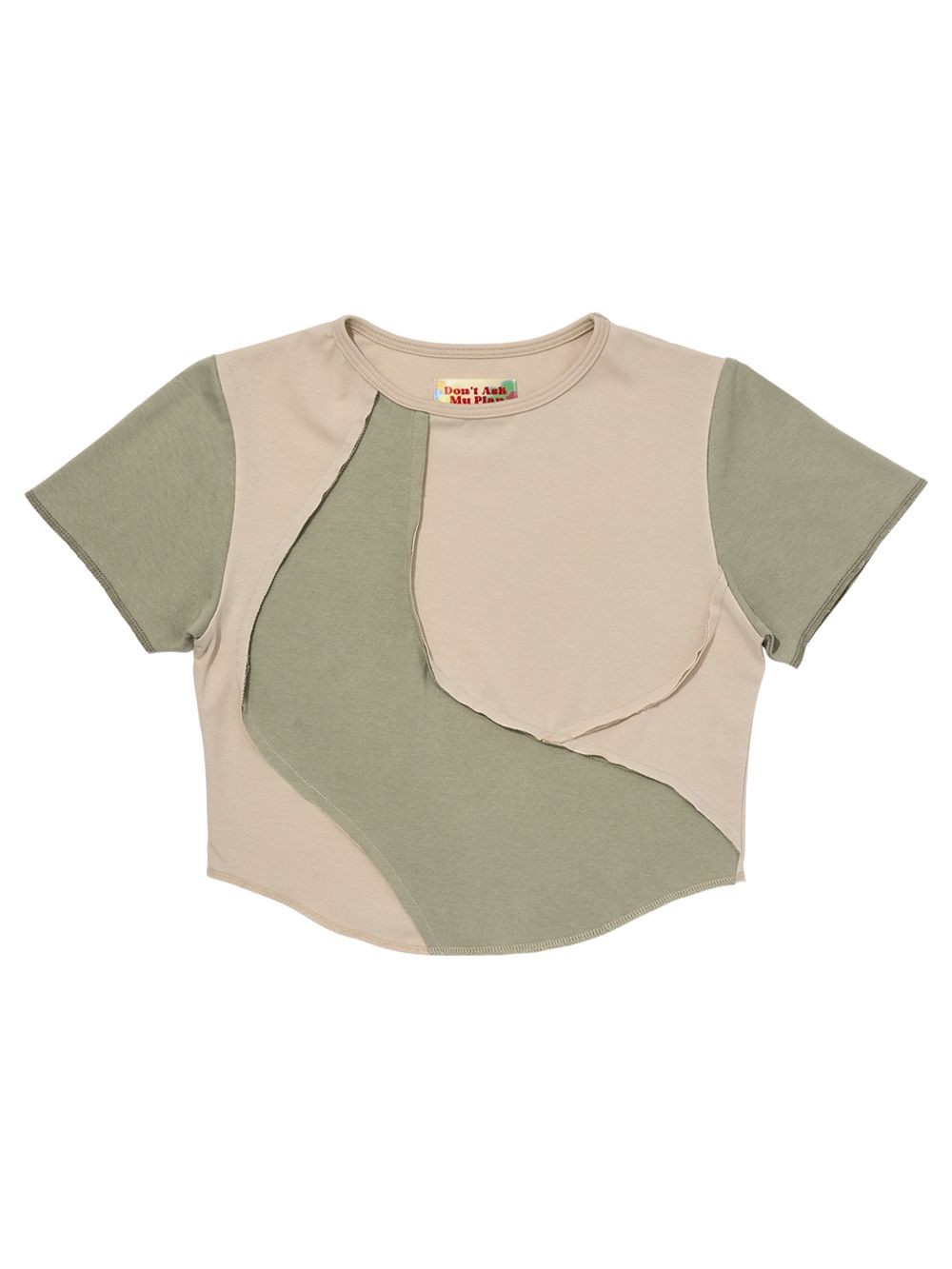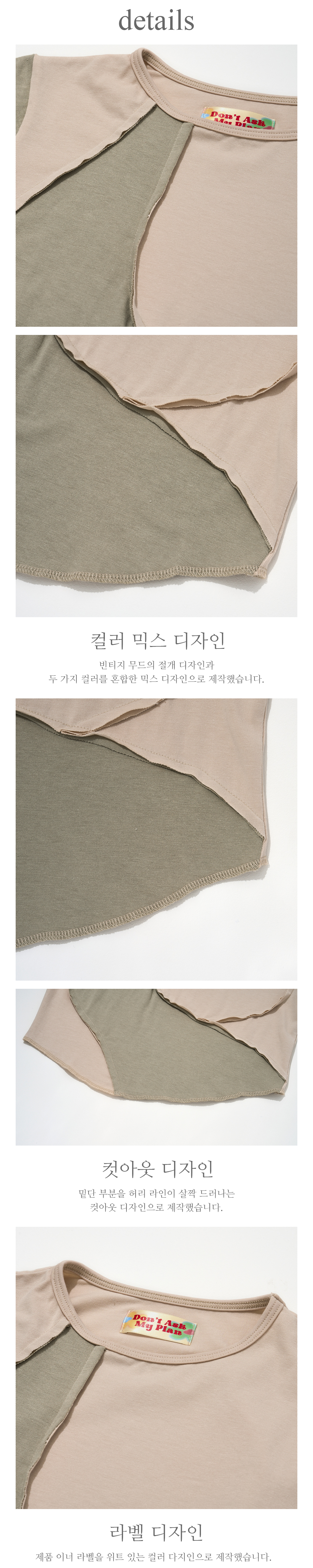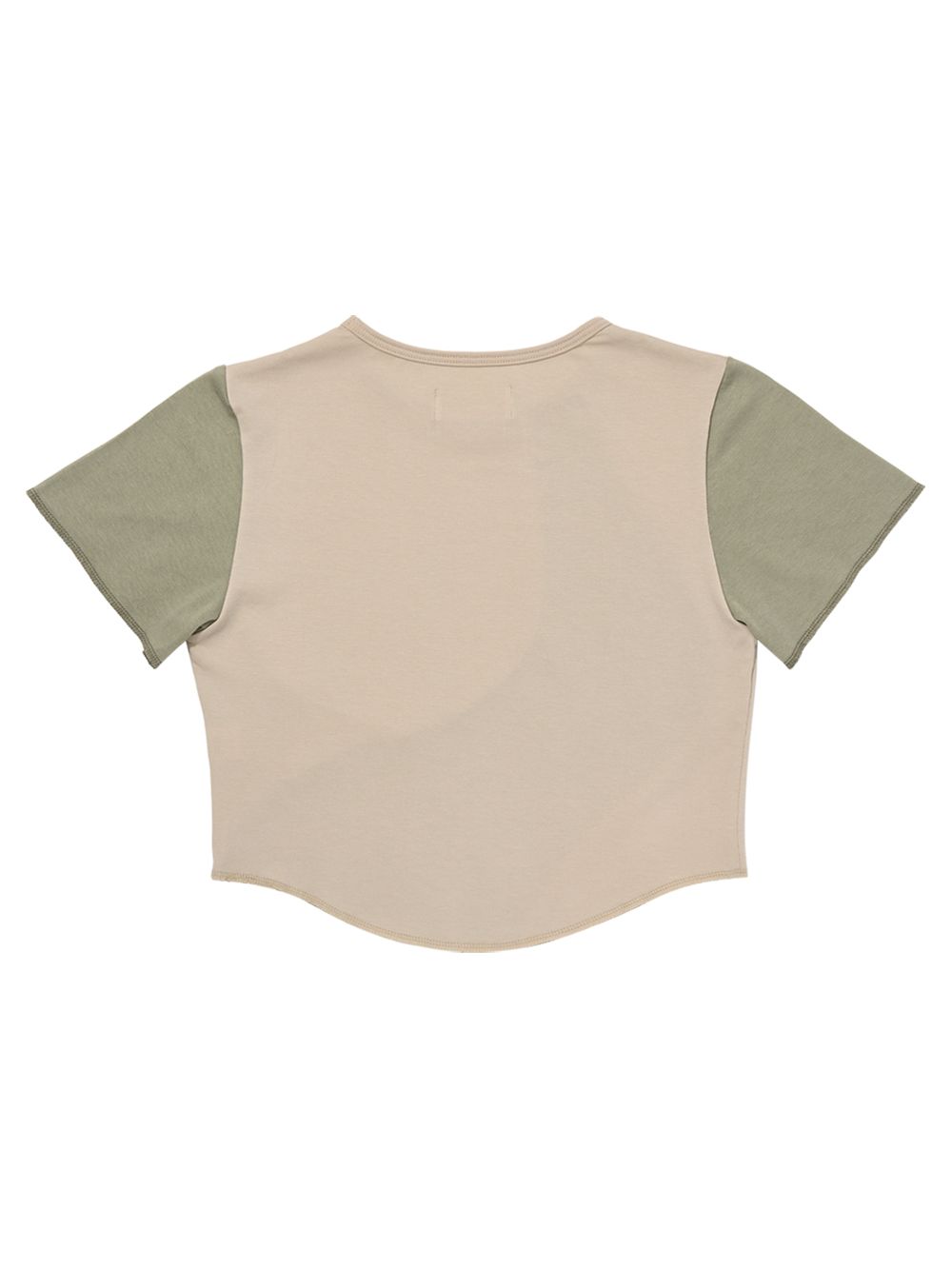 - 빈티지 무드의 절개 디자인과 컬러 믹스 디자인이 매력적인 크롭 스타일의 반팔 티셔츠입니다.