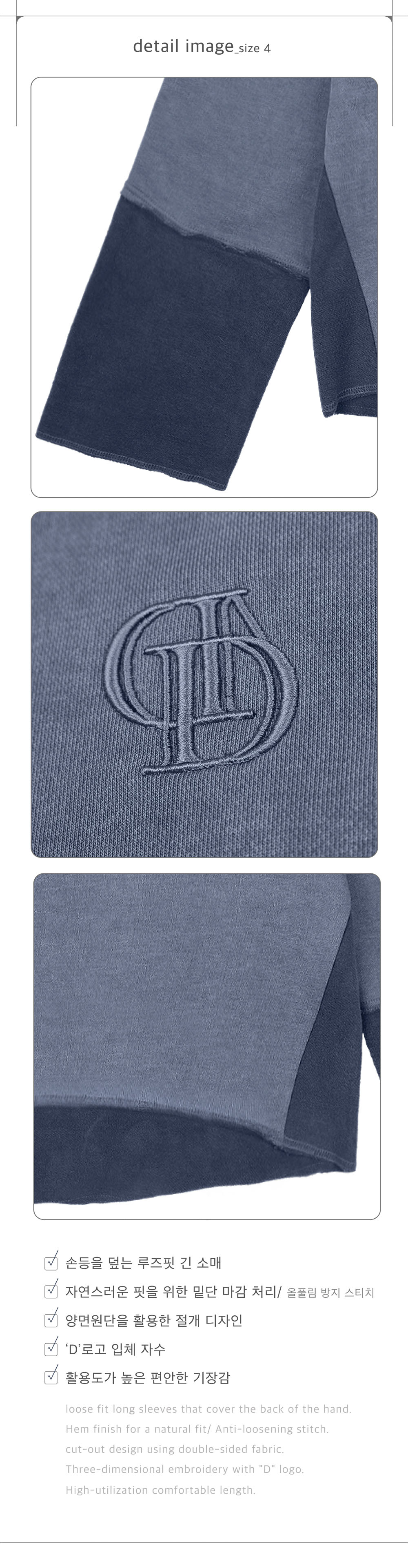 - 전체적으로 루즈한 핏이며 양면원단을 활용한 절개 디자인으로 멋스러운 디테일을 더했습니다