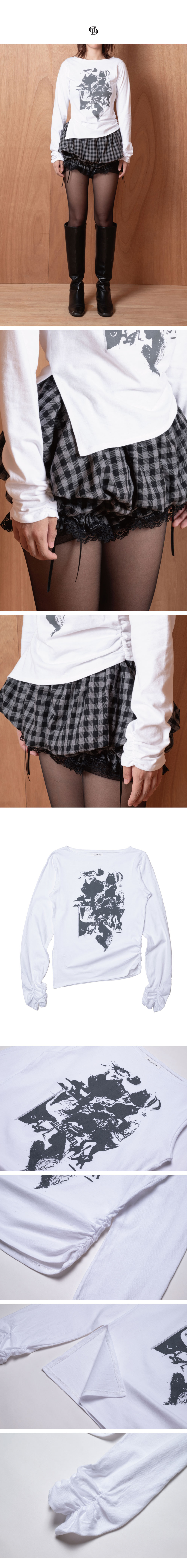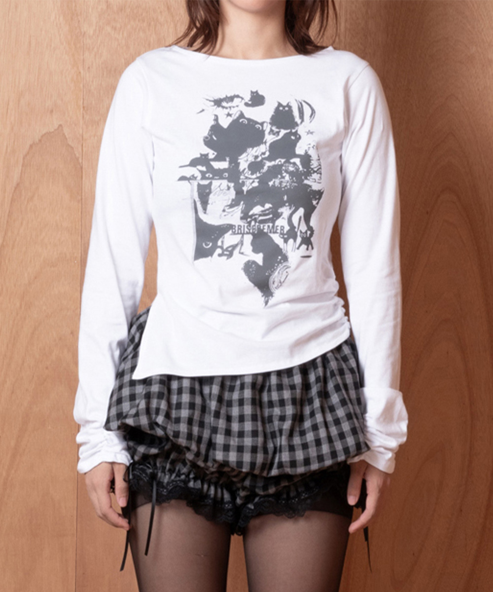세련되면서도 편안한 무드를 연출하는 보트넥 롱슬리브입니다. 왼쪽 밑단의 감각적인 셔링과 오른쪽 밑단의 깔끔한 트임으로 이루어진 비대칭 실루엣이 돋보이며, 시크한 검은 고양이 그래픽을 더하여 포인트를 주었습니다.